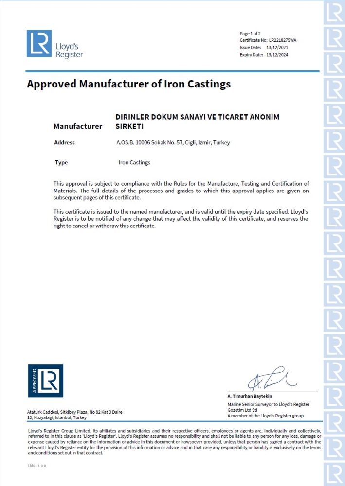Dirinler foundry is certified by ISO 9001-2015 quality management standard and registered by Bureau Veritas, Lloyds Register, Det Norske Veritas, Germanischer Lloyd and American Bureau of